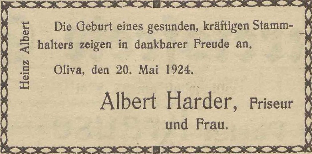 Albert Harder. Albert Heinz. Olivaer Zeintung nr 118 z 21. 05. 1924 r.