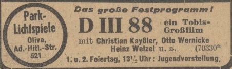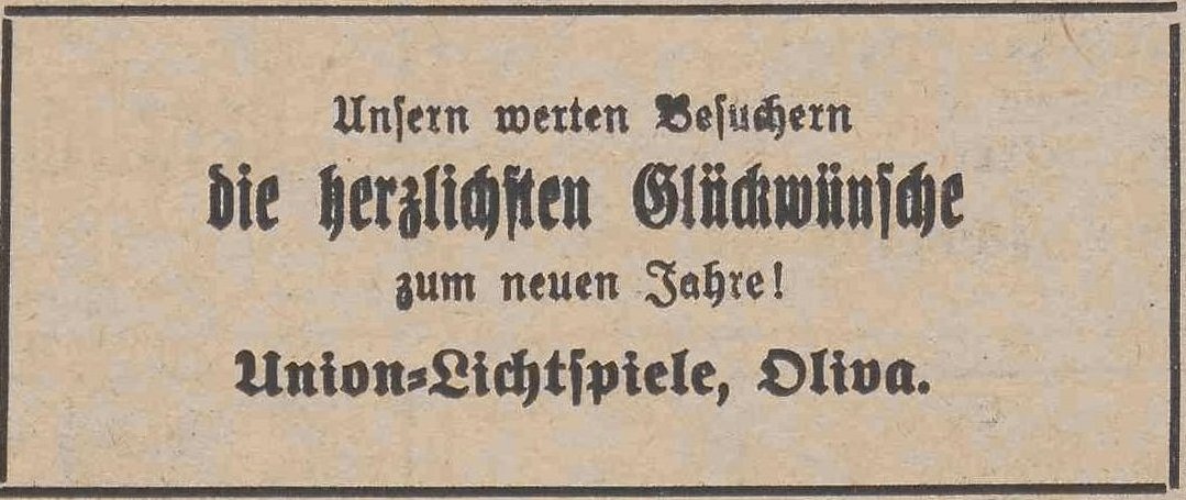 Union Lichtspiele. Podziękowania noworoczne, Danziger General (Olivaer Zeitung) nr 306 z 31. 12. 1926.