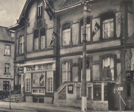 Kino. Restauracja. Fragment pocztówki wysłanej w 1943 roku. Zbiory Krzysztofa Gryndera.