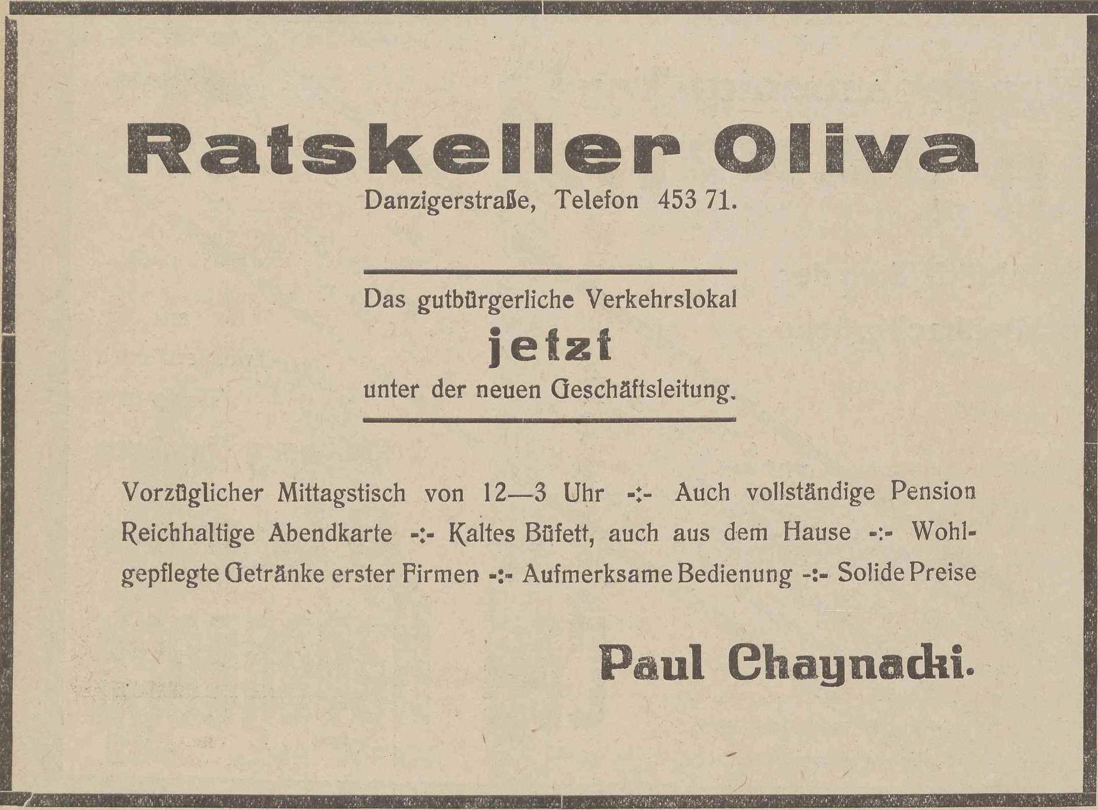 Ratskeller Oliva. Paul Chaynacki. Tel. 45-371. Danzig-Olivaer Zeintung nr 17 z 17. 05. 1930 r.