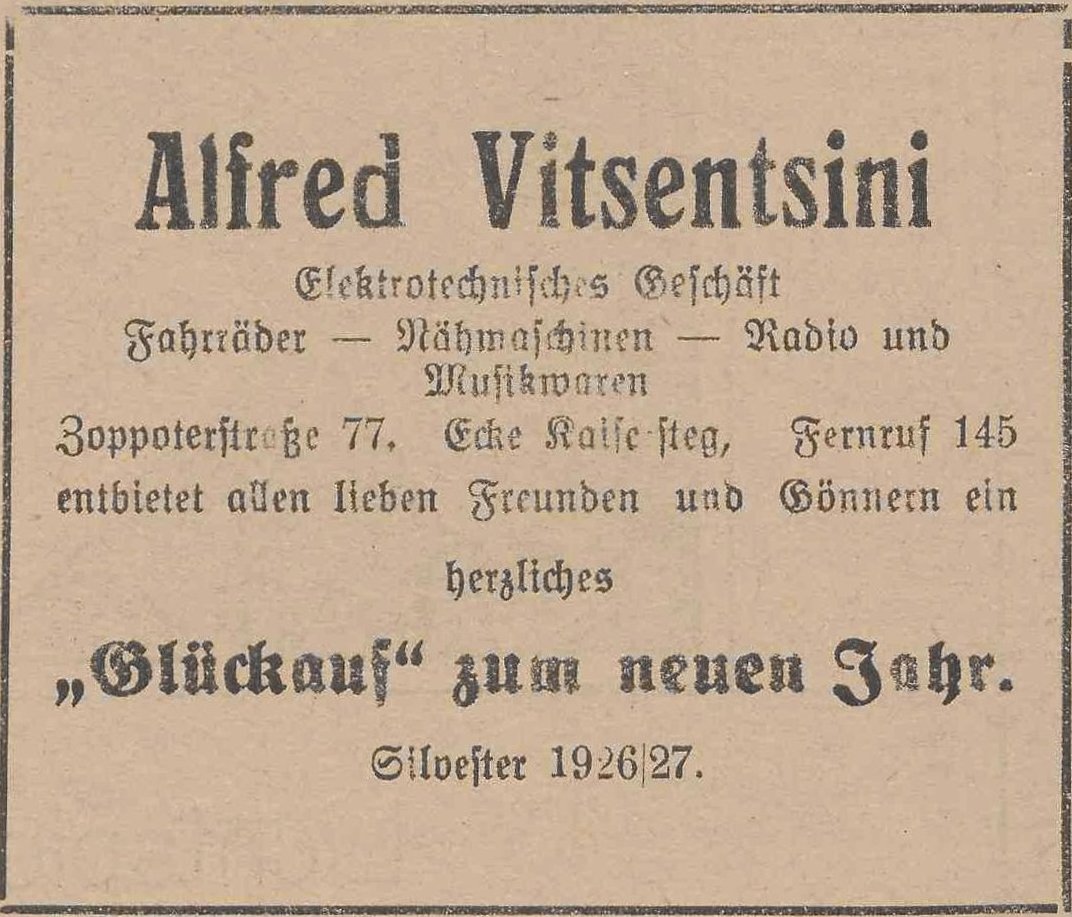 Alfred Vitsentsini. Podziękowania noworoczne, Danziger General (Olivaer Zeitung) nr 306 z 31. 12. 1926.
