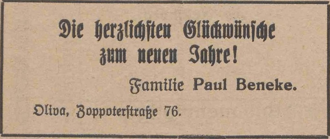 Paul Beneke. Podziękowania noworoczne, Danziger General (Olivaer Zeitung) nr 306 z 31. 12. 1926.