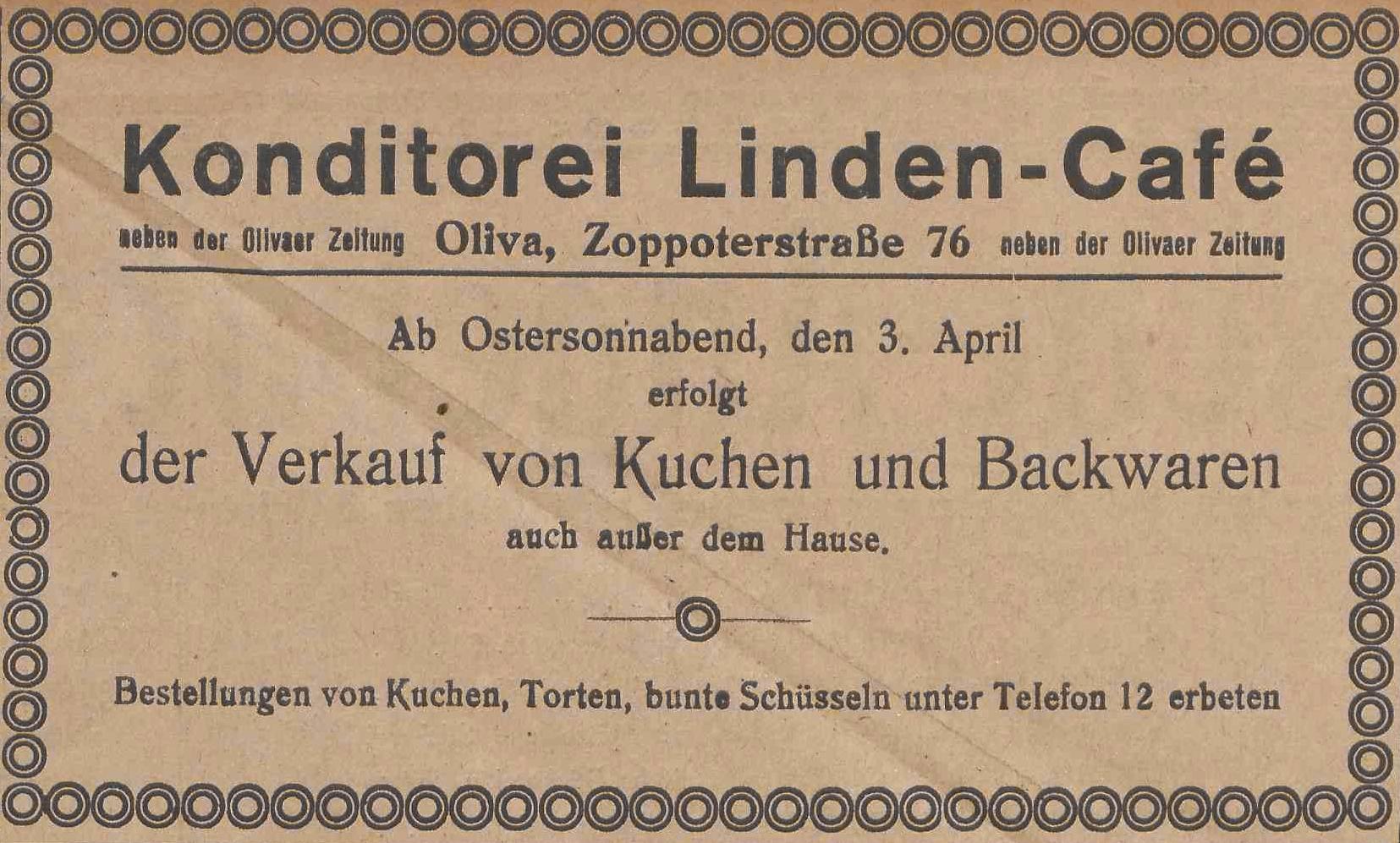 Linden Café. Anzeiger mit der "Olivaer Zeitung", nr 87 z 15. 04. 1926.