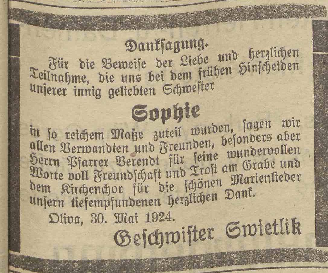 Sophie. Geschwister Swietlik. Olivaer Zeintung nr 126 z 31. 05. 1924 r.