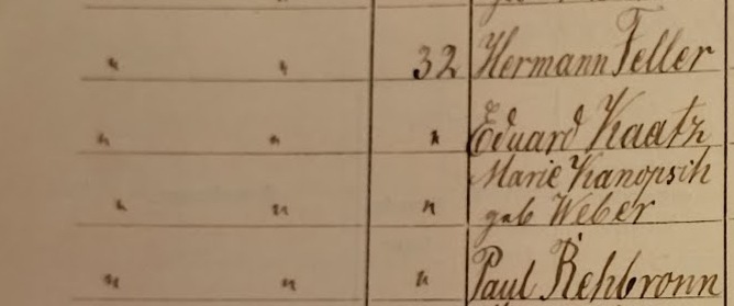 Zoppoter Chaussee 32: Hermann Feller. Eduard Kaatz. Marie Kanopsch zd. Weber. Paul. Rehbronn. Spis z 1895 roku. Przekazała Grażyna Niemyjska.