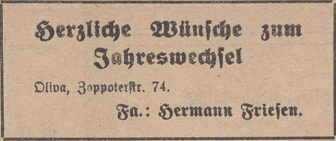 Hermann Friesen. Podziękowania noworoczne, Danziger General (Olivaer Zeitung) nr 306 z 31. 12. 1926.