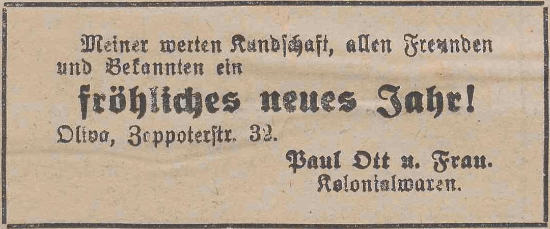 Paul Ott, Kolonialwaren. Podziękowania noworoczne, Olivaer Zeitung nr 306 z 31. 12. 1928.