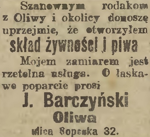 umieszczona w Olivaer Nachrichten z 15. 08. 1909 r. (nr 65), na której na samym dole podano, w jakich oliwskich sklepach można było kupić piwo z tegoż browaru.