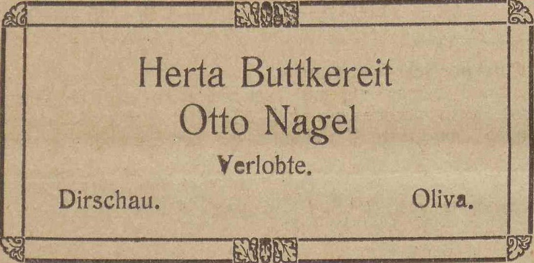 Otto Nagel, Herta Nagel zd. Buttkereit. Zoppoter Straße 32A. Olivaer Zeintung nr 304 z 29. 02. 1920 r.