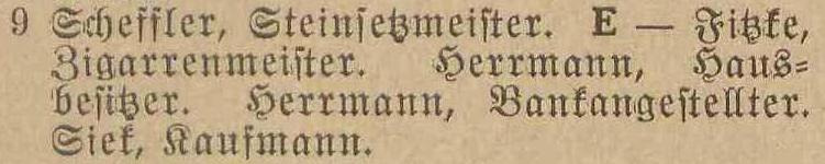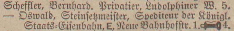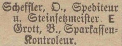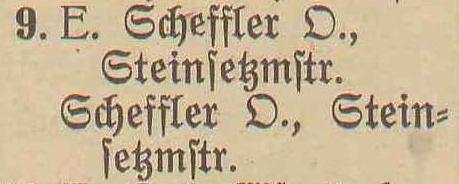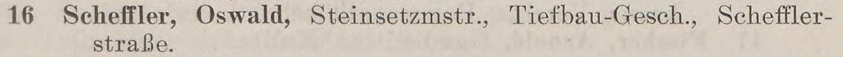 Oswald Scheffler. Steinsetzmeister. Książka telefoniczna z 1911 roku. Przekazała Grażyna Niemyjska. Zbiory Pomorskiej Bibl. Cyfrowej.
