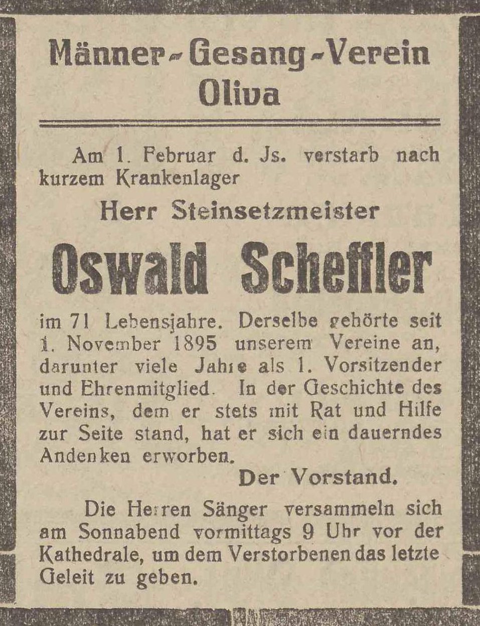 W 1902 roku w Oliwie zainstalowanych było 9 numerów telefonów. Numer 4 należał do Oswalda Schefflera.