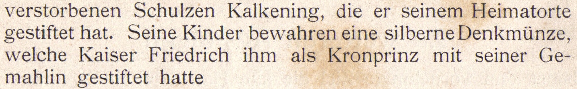 Das wundersamste Museum der Welt wird dort gezeigt. Es besteht in den Kunstprodukten eines Naturmalers, des verstorbenen Schulzen Kalkening, die er seinem Heimatorte gestiftet hat. Seine Kinder bewahren eine silberne Denkmünze, welche Kaiser Friedrich ihm als Kronprinz mit seiner Gemahlin gestiftet hatte.