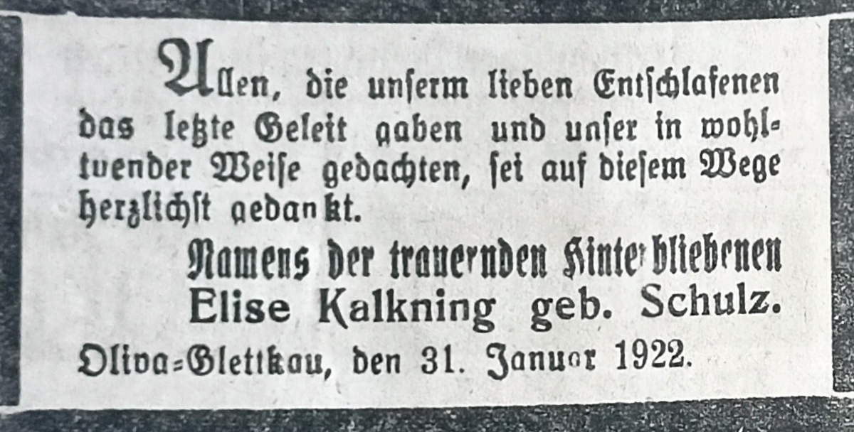 Elise Kalkning zd. Schulz. 31. 01. 1922. Danziger Kreis-Zeitung 1922. Przekazała Grażyna Niemyjska.