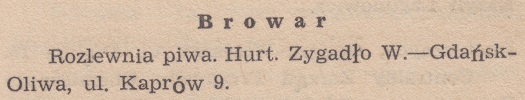 W. Zygadło. Rozlewnia piwa. Skorowidz inf. z marca 1946 roku. Zbiory Mirosława Piskorskiego.