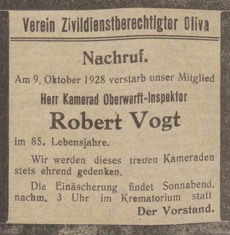 Robert Vogt. Olivaer Zeintung nr 239 z 10. 10. 1928 r.