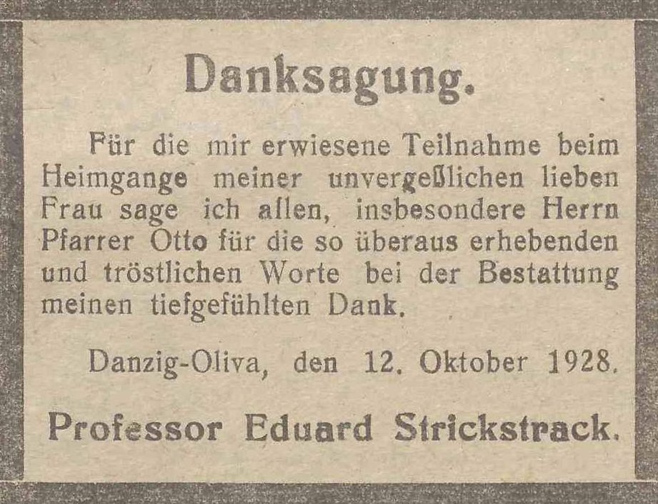 Marie Strickstrack zd. Glupe. Eduard Strickstrack. Olivaer Zeintung nr 237 z 08. 10. 1928 r.