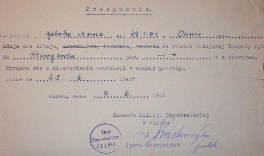 Przepustka na przejazd Oliwa-Starogard wydana w dniu 9. 6. 1945 roku. Internet: www.Allegro.pl.