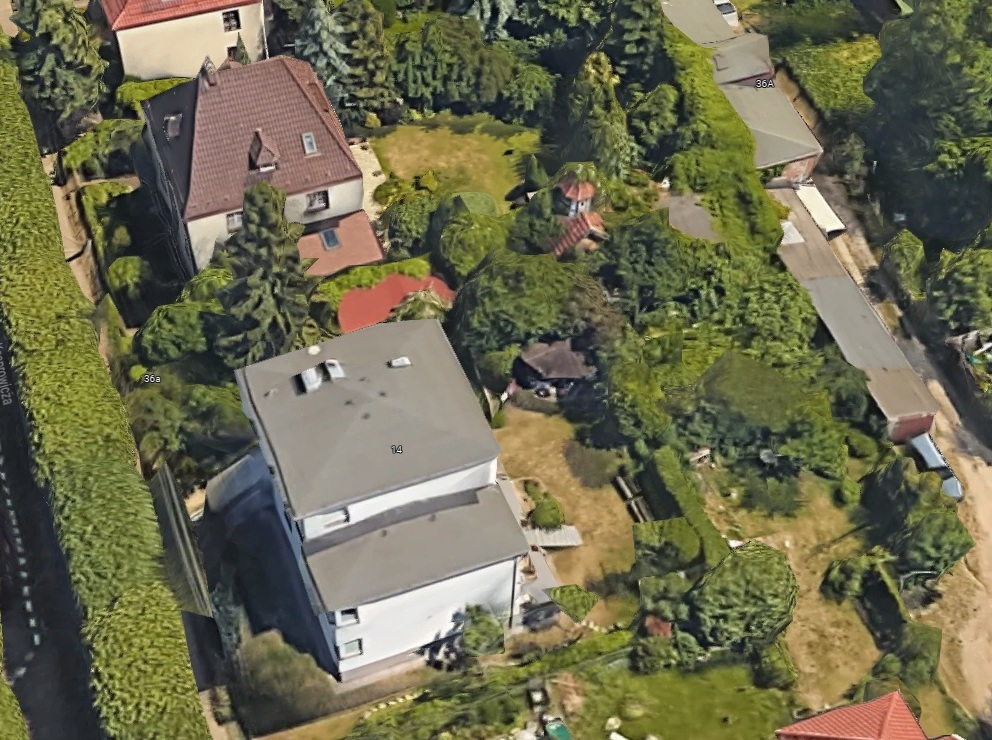 U góry budynek nr 13. Na dole nr 14. Pomiędzy budynkami po prawej tzw. "Gołębnik". 2022.