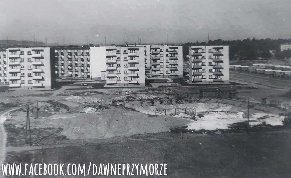W głębi trzy bloki nr 20, 21 i 22 przy ul. Krzywoustego wybudowane na początku lat 60. XX wieku. Przed budynkami na niezagospodarowanym placu pomiędzy ulicami Krzywoustego, Chłopska i Czerwony Dwór powstanie niebawem "Rynek Przymorski". Ze zbiorów Kuby Kowalskiego (FB Dawne Przymorze).