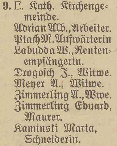 1916: Gemeinde Oliva. (właściciel). Aderjahn, Arbeiter. Axt, Witwe. Heinowski, Rentenempfänger. Labudda, Witwe. Pinunski, Witwe. Swiczkowski, Arbeiter. Zimmerling, Witwe.