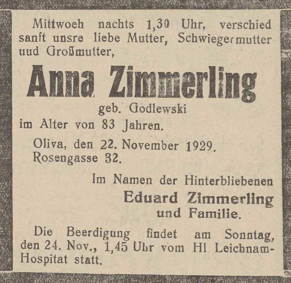 Rosalie Zimmerling zd. Wittstock (verw. Müller). Eduard Zimmerling. Olivaer Zeintung nr 118 z 21. 05. 1927 r.