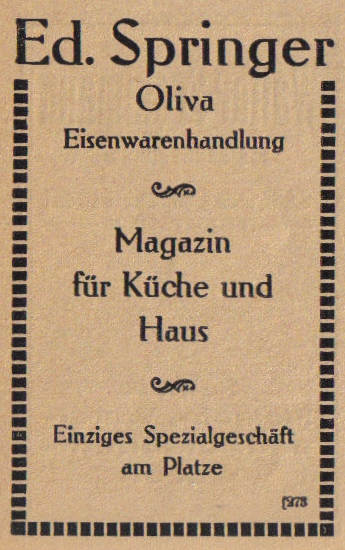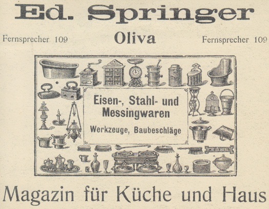 Eduard Spinger. Magazin für Kuche und Häus. Reklama z 1916 roku. Zbiory Pomorskiej Biblioteki Cyfrowej.