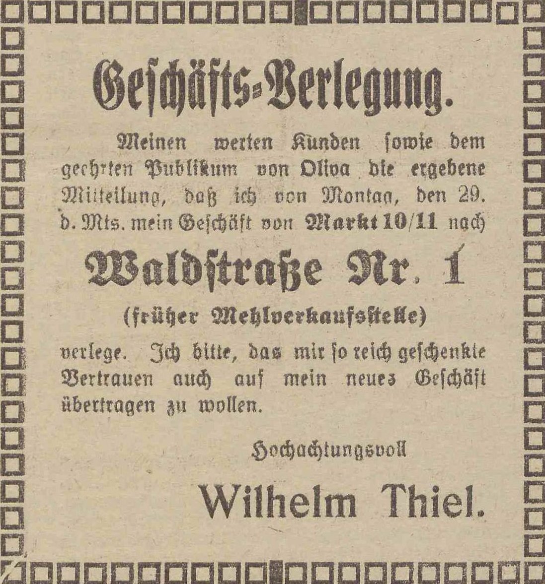 Przeniesienie sklepu z Am Markt 10/11. Wilhelm Thiel. Olivaer Zeintung nr 278 z 27. 11. 1920 r.