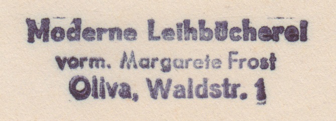 Margarete Frost. Wypożyczalnia książek. Pieczątka z ksiąki. Zbiory Kuby Kowalskiego (Facebook: Dawne Przymorze).