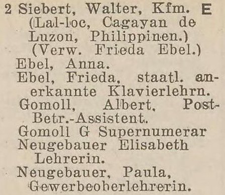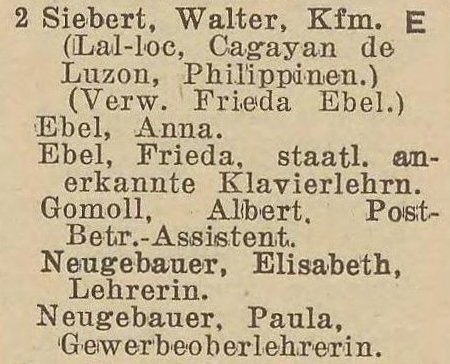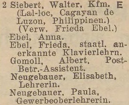 Kupiec Walter Siebert kupił kamienicę ok. 1920. Przebywał kilka lat na Filipinach, podając jako adres miasto Lal Lo stolicę prowincji Cagayan. To było ok. 1933-1937. W jego zastępstwie opiekę nad kamienicą sprawowała Frieda Ebel. Po powrocie z Filipin zamieszkał przy Wita Stwosza 18a, a podczas II wojny przeniósł się na wieś Nowe Monasterzysko koło Pasłęka.