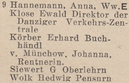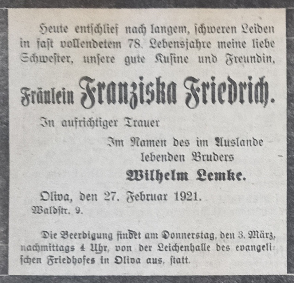 Wilhelm Lemke. Franziska Friedrich (Kronprinzenallee 21, 23). Danziger Kreis-Zeitung 1921. Przekazała Grażyna Niemyjska.