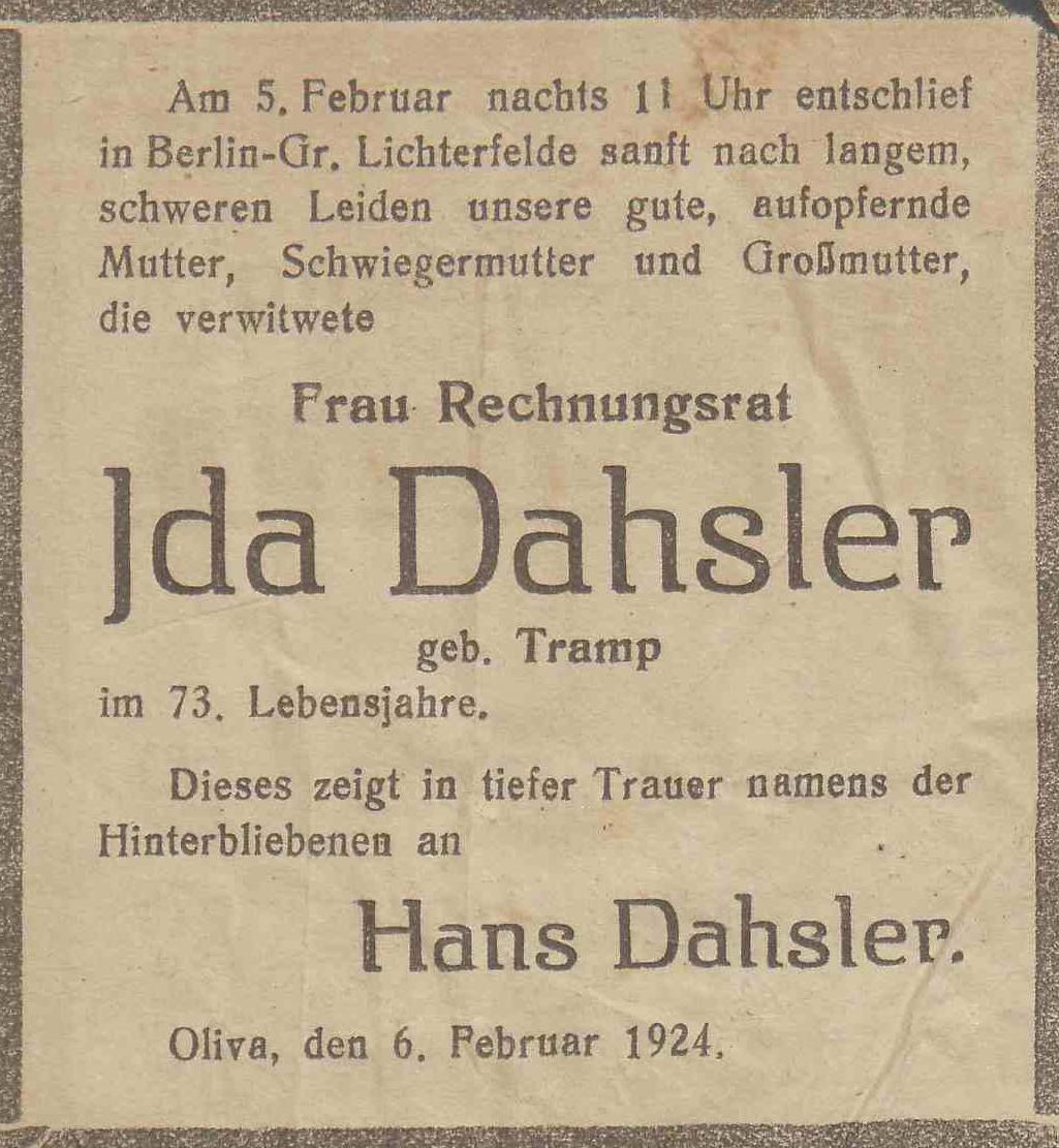 Ida Dahsler z domu Tramp zmarła w wieku 73 lat. Hans Dahsler. Olivaer Zeintung nr 32 z 07. 02. 1924 r.