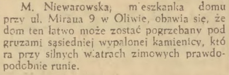 "Mieszkam na ul. Miraua. Znajdują się na niej cztery bloki numery 1 do 9 to budynki wybudowane w okresie między wojennym, budynek numeracja 10 do 12 odbudowany po wojnie na starych fundamentach. W tym samym czasie odbudowano budynek weterynarii na rogu Kaprów i Miraua. W 60-tych latach wybudowano garaże i magazyny pod zarządem Administracji Domów Mieszkalnych (straszne okropieństwo) przed kilku laty po pożarze rozebrany placyk niestety nie został zagospodarowany i służy za wysypisko śmieci. Pozostały jeszcze okropne pawilony również wybudowane w latach 60-tych administracyjnie przynależne do Derdowskiego."