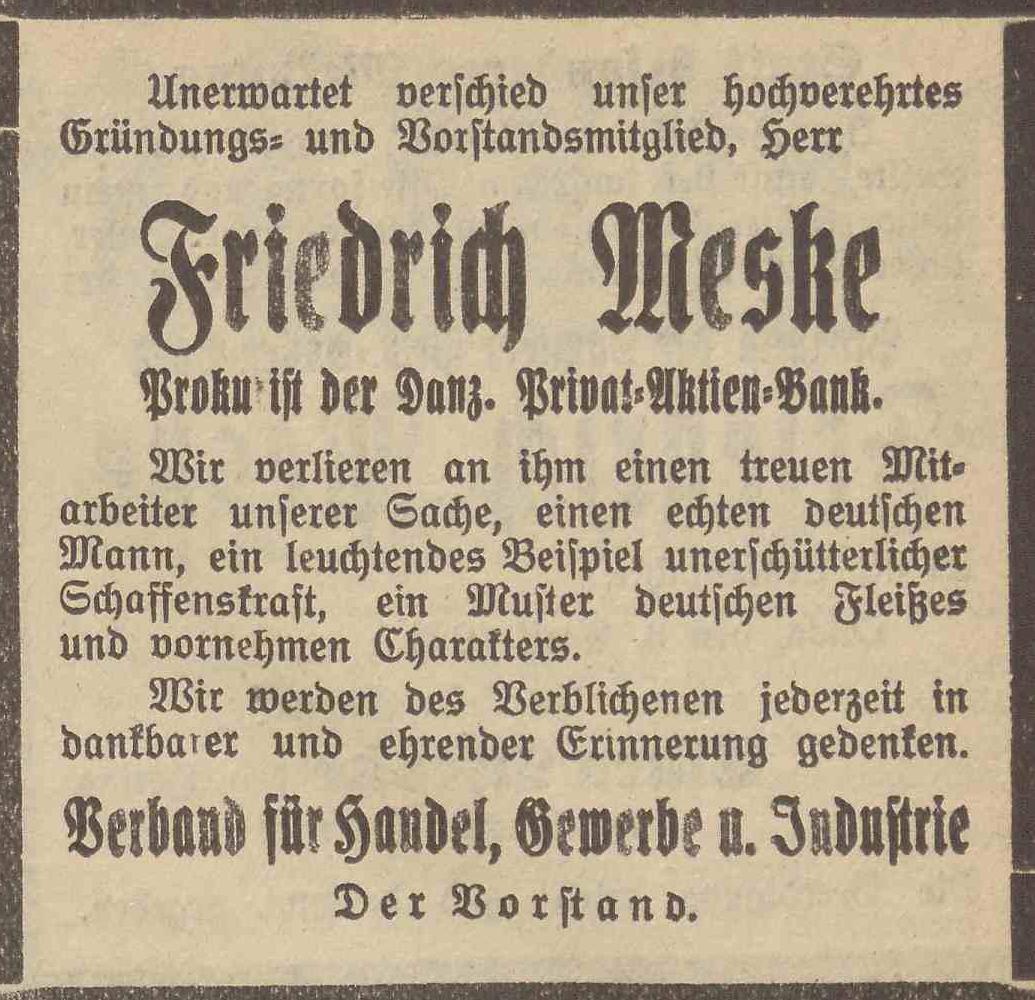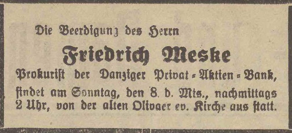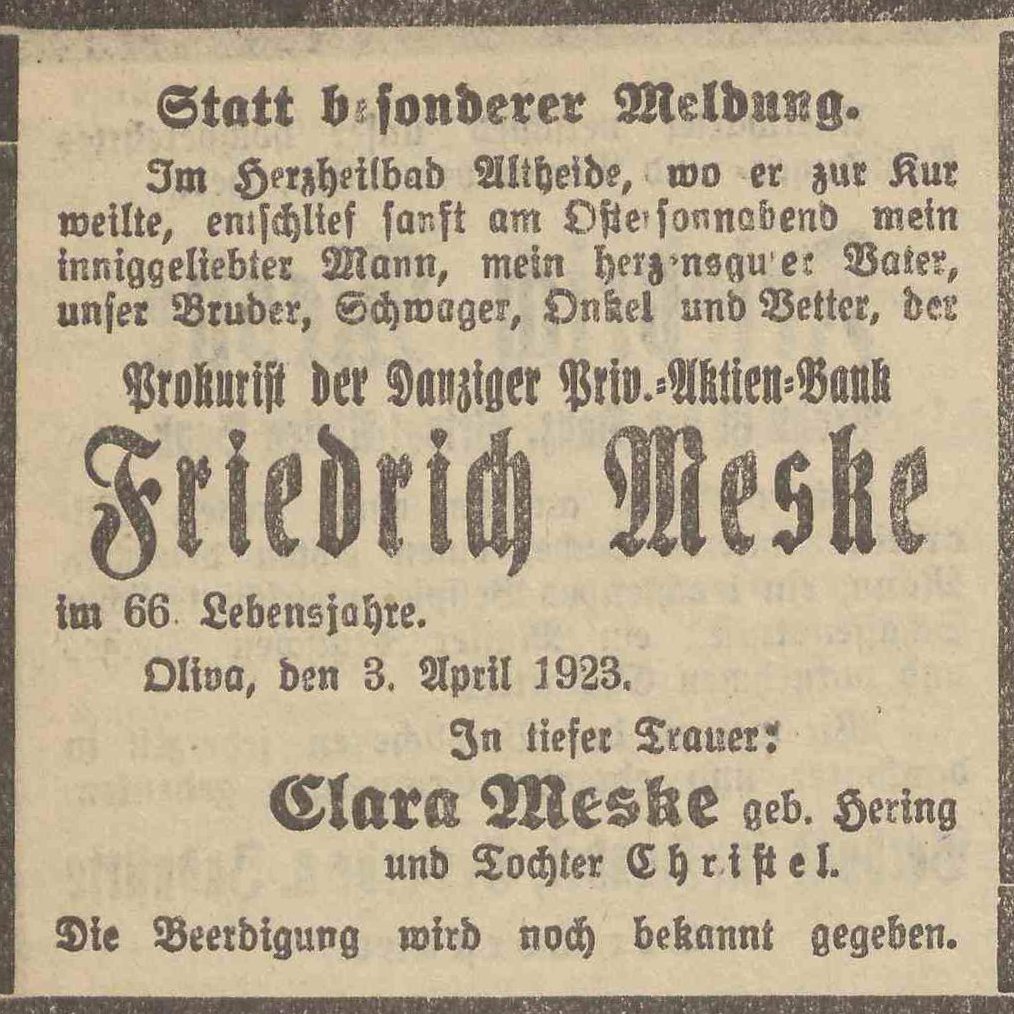 Friedrich Meske. Olivaer Zeintung nr 81 z 07. 04. 1923 r.