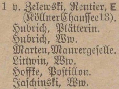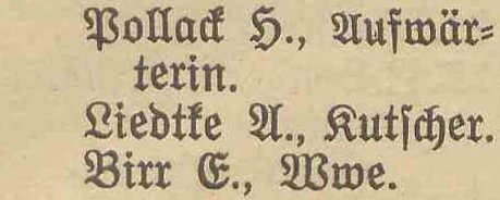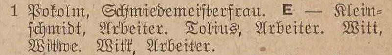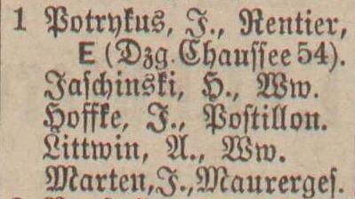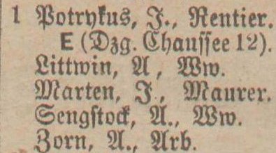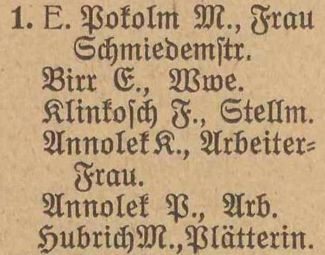 Doering, Anton, Arb. Huse, Pauline, geb. Ritter, Wäscherin. Littwin, Auguste, geb. Szodi, Ww. Schroeder, B., geb., Ficht, Arbeiterfrau. Schulz, Johann, Arb.