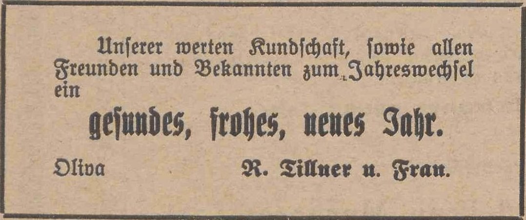 Rochus Tillner. Podziękowania noworoczne, Olivaer Zeitung nr 306 z 31. 12. 1920.