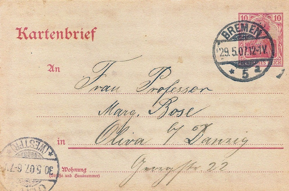 Marg. Bose. Karta wysłana z Bremy 29. 5. 1907 r. Dotarła do Oliwy 30. 5. 1907 r. Internet: www.Allegro.pl.