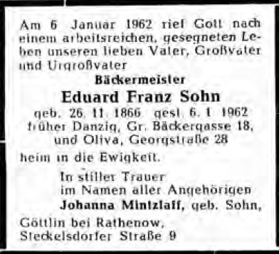 1928-1942 - Franz-Eduard Sohn. Bäckermeister. Internet: www.danzig.de - Sterbeanzeigen.