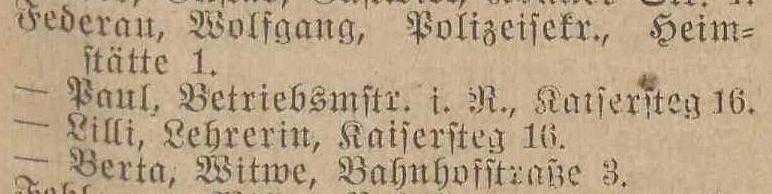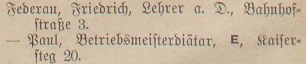 Paul Federau, Betriebsmeisterdiätar, E (w³aœciciel), Kaisersteg 20.