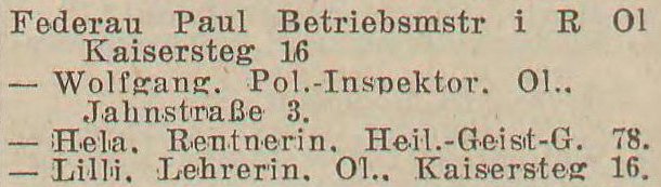 Hella Federau, Postgehilf., Kaisersteg 16.