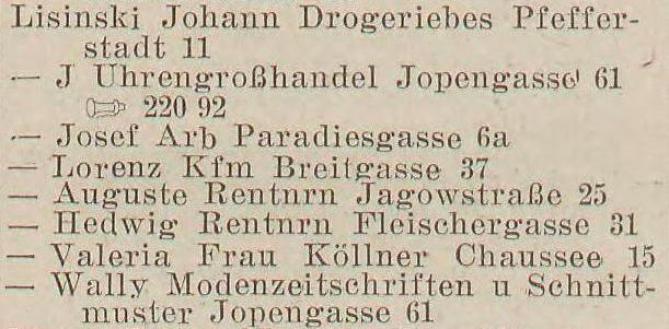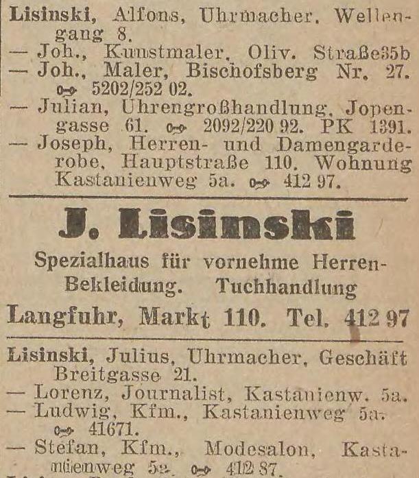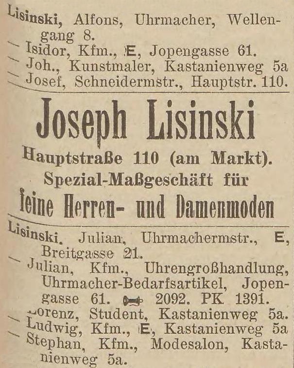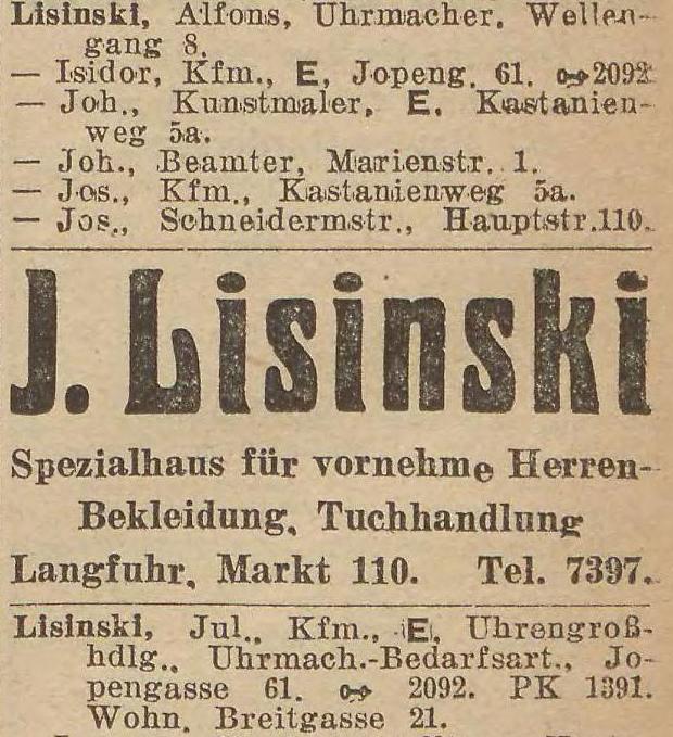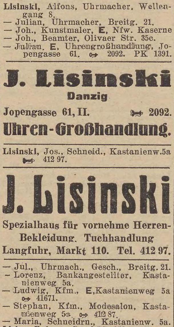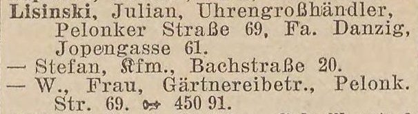Julian Lisinski, Uhrengroßhändler, Pelonken Straße 69, Fa. Danzig, Jopengasse 61.