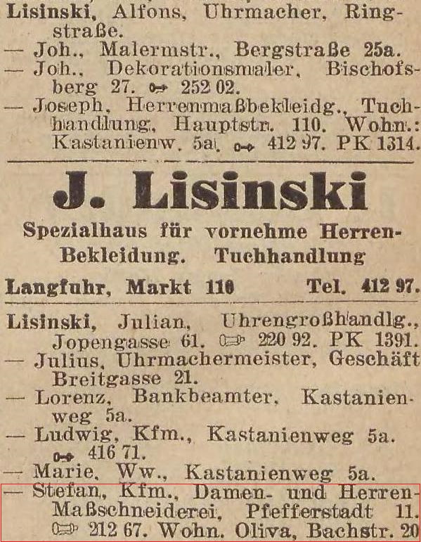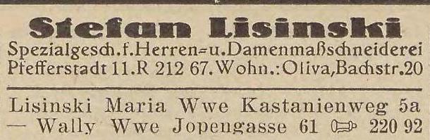 Stefan Lisinski, Herren u. Damenmaßschneriderei, Bahnstraße 20.