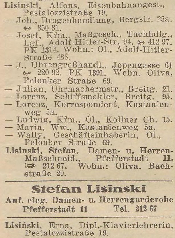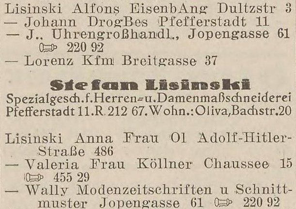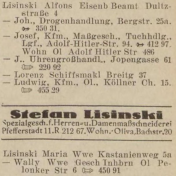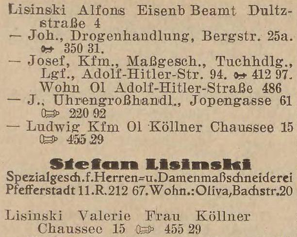 Josef Lisinski, Kfm., Maßgesch., Tuchhdlg., Adolf-Hitler-Straße 486.