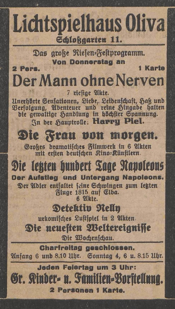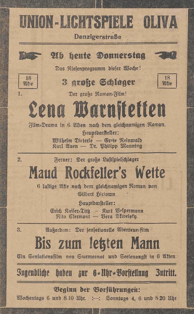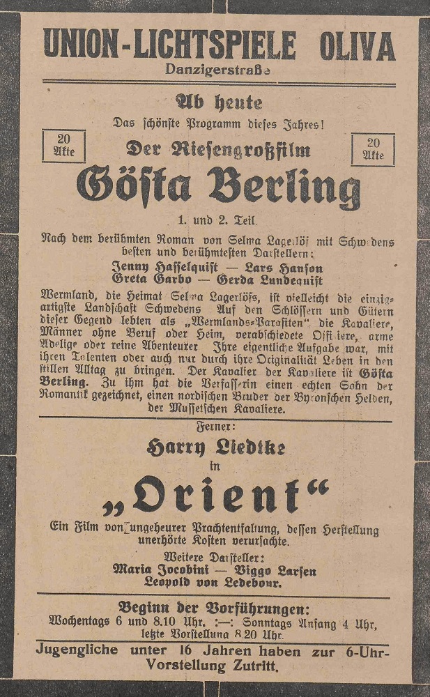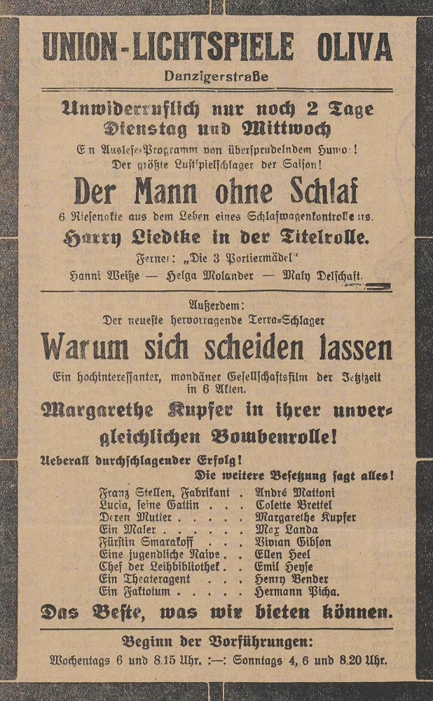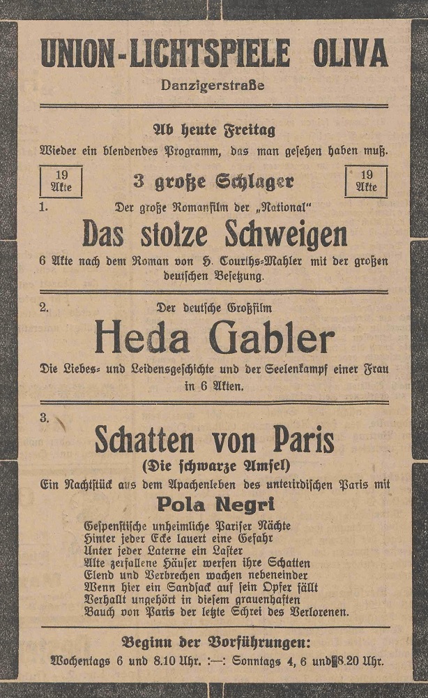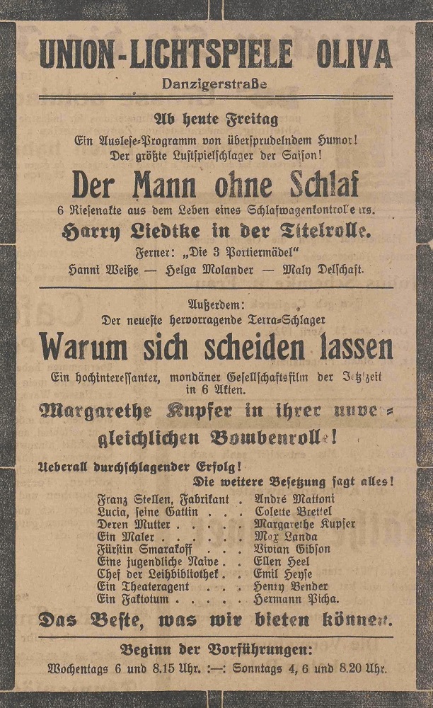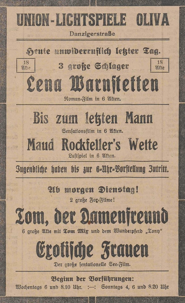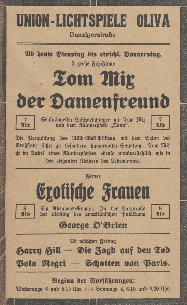 Lichtspielhaus Oliva - Am Schloßgarten 11 Union-Lichtspiele Oliva - Danziger Straße 2 Danziger General - Anzeiger mit der "Olivaer Zeitung" nr 77 z 01. 04. 1926 r.