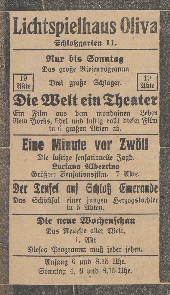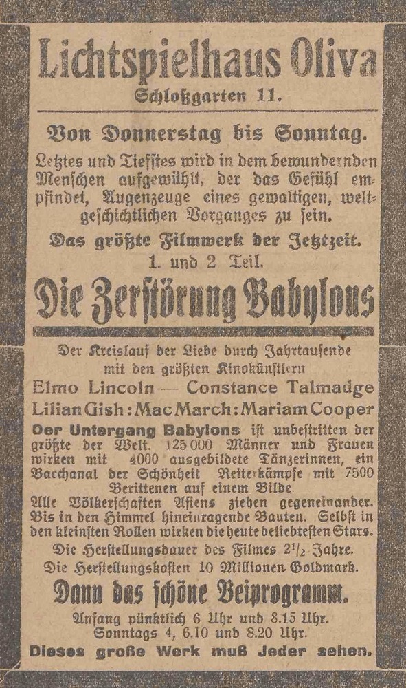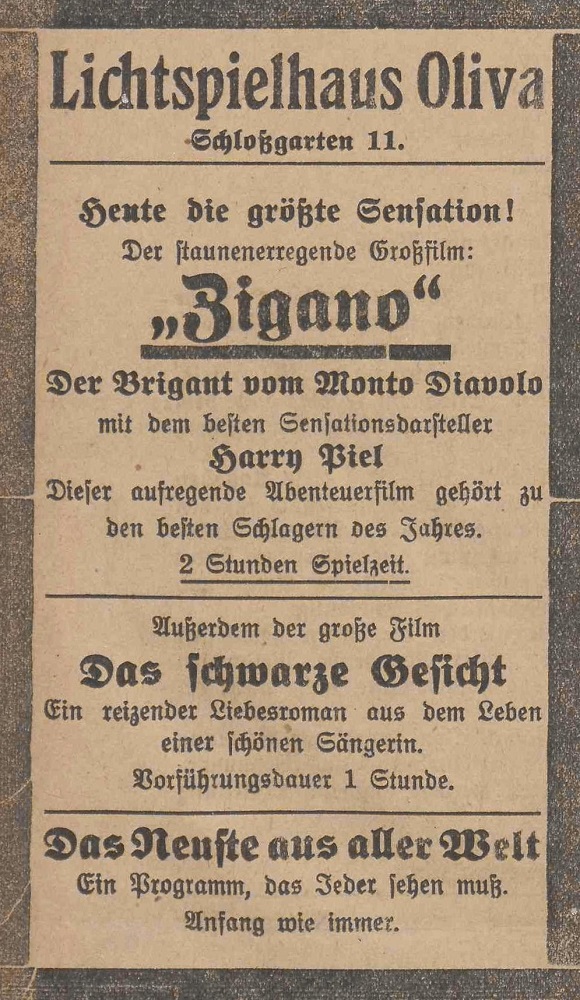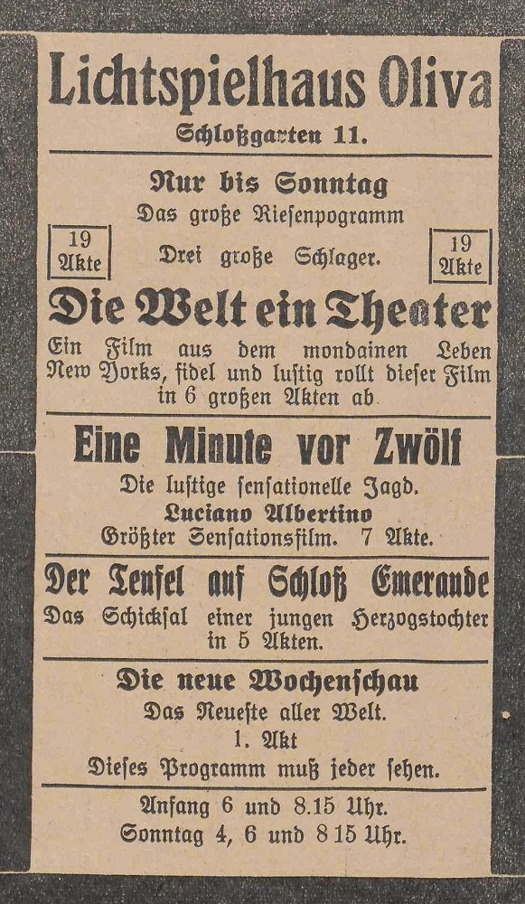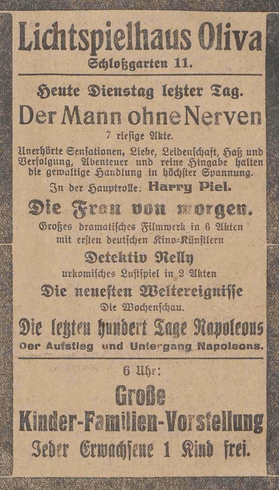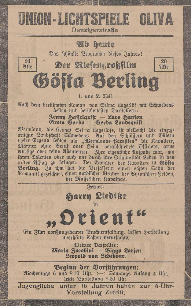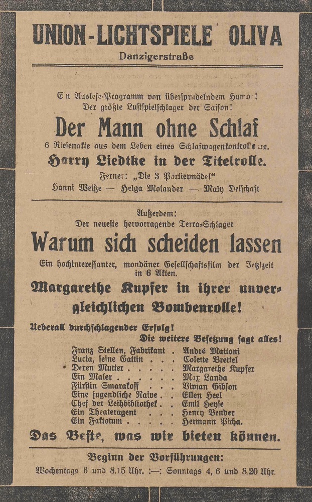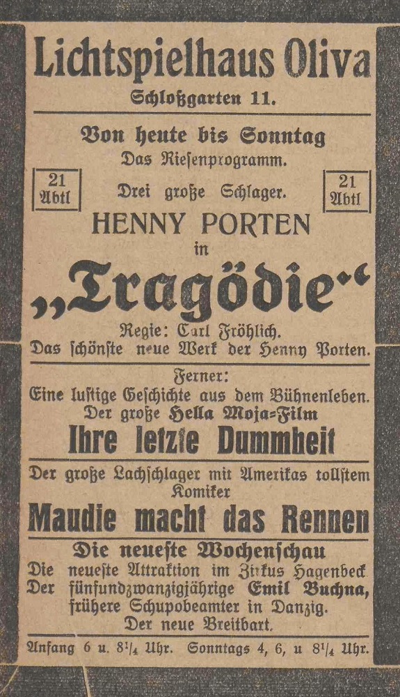 Lichtspielhaus Oliva - Am Schloßgarten 11 Union-Lichtspiele Oliva - Danziger Straße 2 Danziger General - Anzeiger mit der "Olivaer Zeitung" nr 77 z 01. 04. 1926 r.