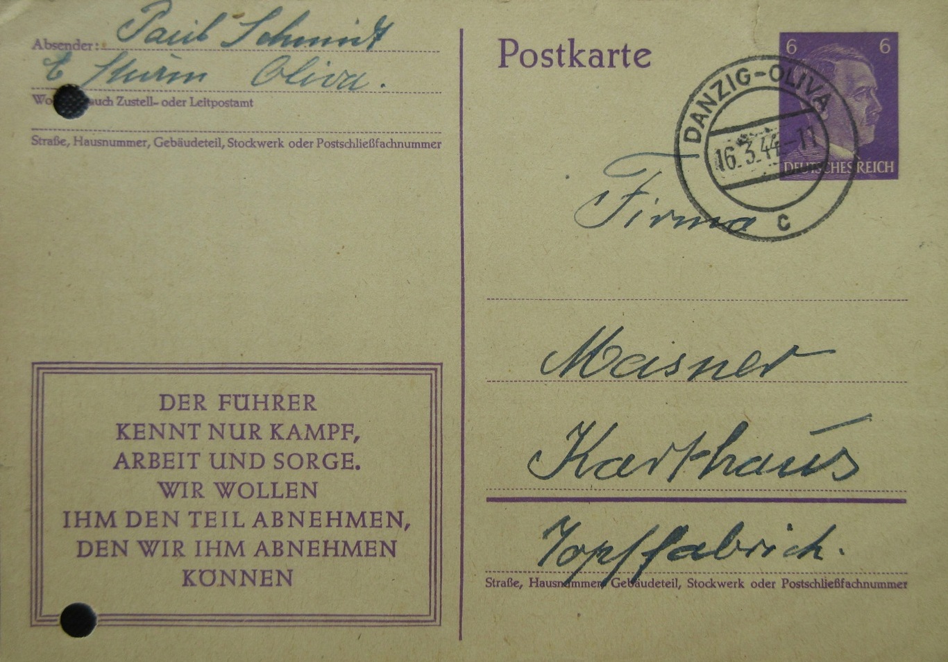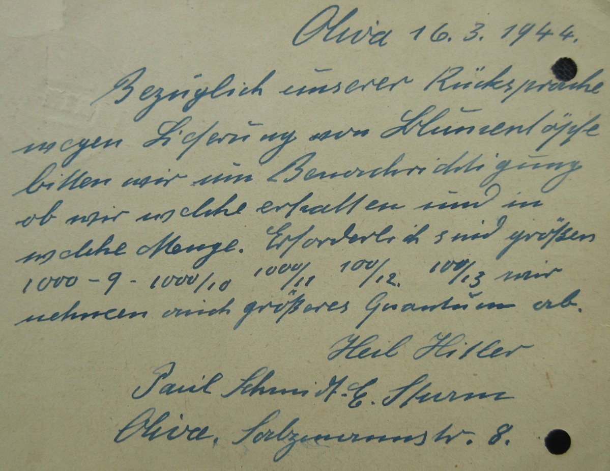 Paul Schmidt. Oliwa - Kartuzy. Korespndencja z 16. 03. 1944 roku. Ze strony www.Allegro.pl.