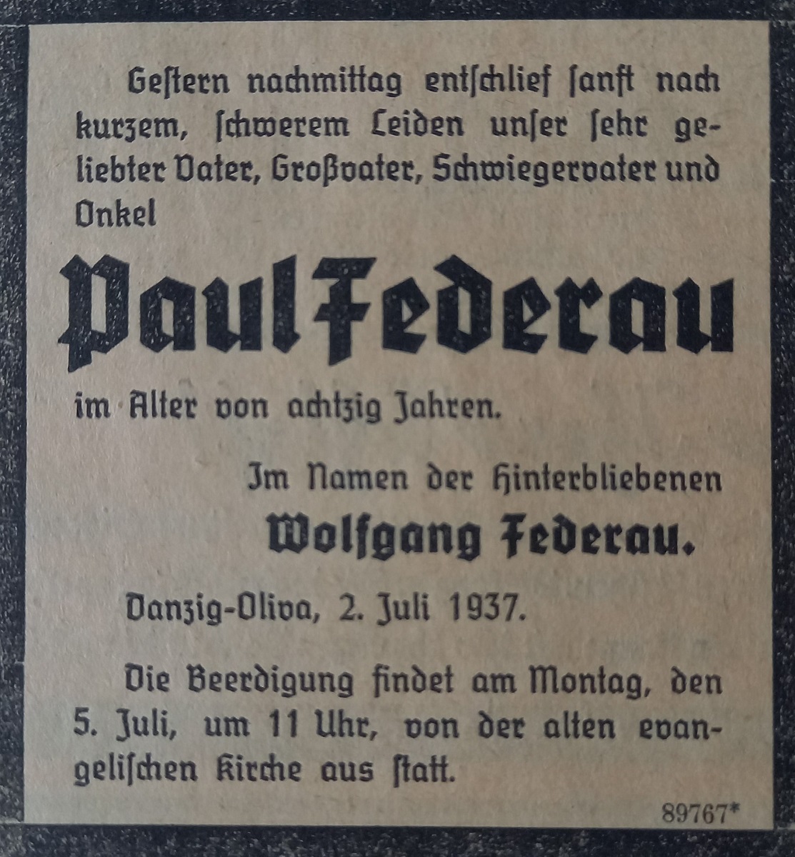 Paul Federau zmarł 01-07-1937 r. Przekazała Grażyna Niemyjska.