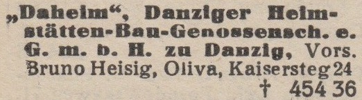 "Daheim", Danziger Heimstätten-Bau-Genossensch. e.G.m.b.H. zu Danzig, Vors. (przewodniczący) Bruno Heising. Książka telefoniczna z 1937 roku. Zbiory TPG Strefa Historyczna WMG.