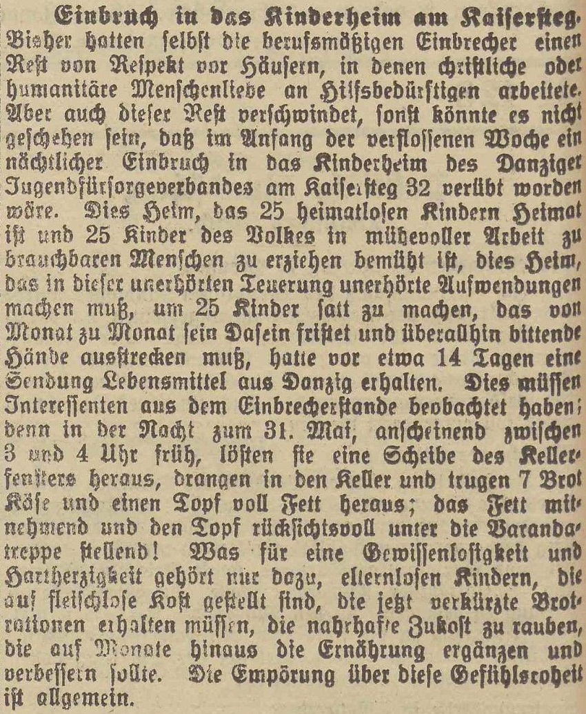 Włamanie do domu dziecka Gdańskiego Towarzystwa Opieki nad Młodzieżą przy Kaisersteg 32. W nocy 31 maja, podobno między 3 a 4 nad ranem złodzieje wynieśli z piwnicy 7 bochenków sera i garnek pełen tłuszczu. Olivaer Zeintung nr 129 z 05. 06. 1923 r.