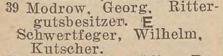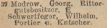 Auch Georg Heinrich Karl Modrow war weichender Erbe eines Gutes in Hinterpommern. Sein Vater Gottfried Heinrich Modrow, älterer Bruder von Wilhelm Modrow (s. o.), erbte von seinem Vater Gut Julienhof, Kreis Dramburg. Geboren als ältester Sohn am 9. Mai 1864 in Julienhof bei Kallies, Kreis Dramburg, besuchte Georg das Realgymnasium in Stettin bis zur Prima, lernte Landwirtschaft und bezeichnete sich seit November 1882 als Landwirt. Er kaufte am 1. Juli 1889 das Gut Neuguth bei Schöneck, Kreis Berent, Westpreußen, zunächst 800 ha, von denen er 108 ha Forst verkaufte. Er baute sämtliche Gebäude, Stallungen wie Wohngebäude neu. Er heiratete am 21. Mai 1891 Gertrud Karow (1869-1945) aus Stargard, Pom. Das Gut wurde 1905 auf „allerhöchste Kabinettsorder“ in Modrowshorst umbenannt und 1920 in Modrowo {Bolesławowo - Zespół Szkół Rolniczych}. Georg Modrow war Hauptmann der Landwehr und vertrat den Wahlkreis Dirschau- Stargard-Berent von 1910-1918 im preußischen Abgeordnetenhaus.