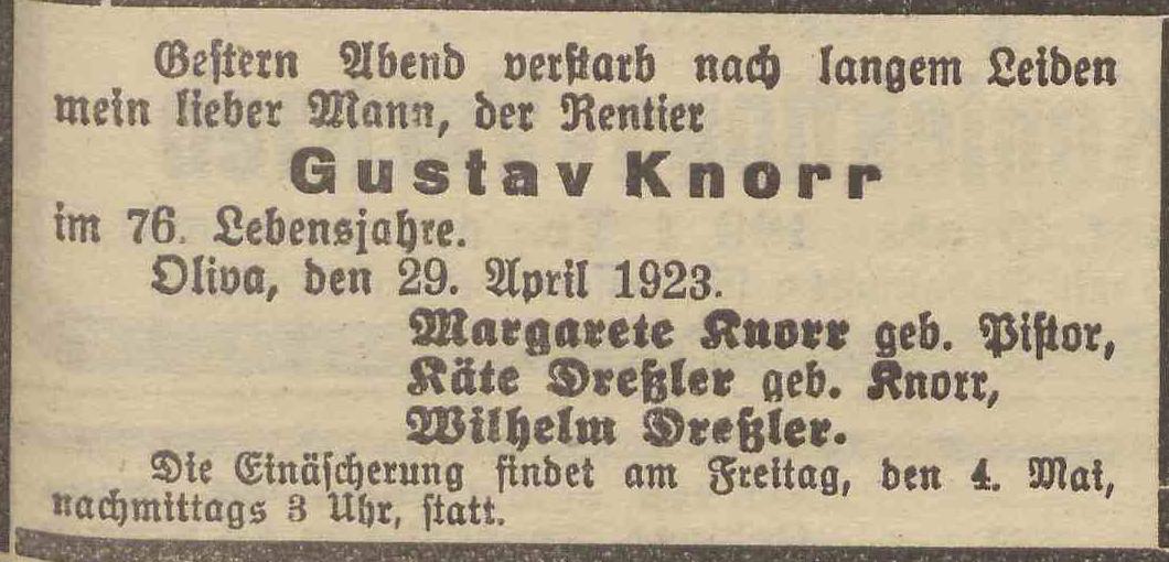Gustav Knorr. Margarette Knorr zd. Wistor. Käte Dreßler zd. Knorr. Wilhelm Dreßler. Olivaer Zeintung nr 101 z 02. 05. 1923 r.